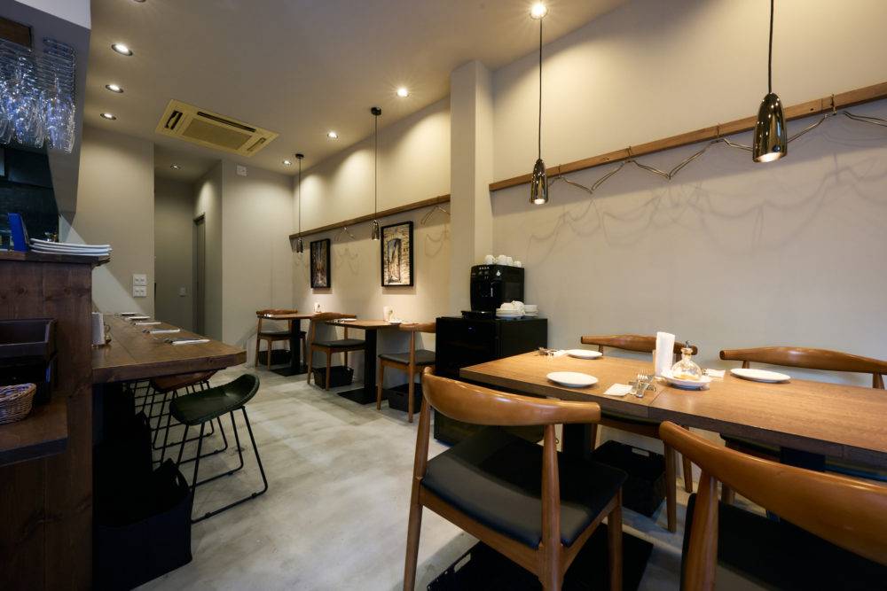 テーブルと椅子の高さ、照明のあたりかたと明るさ、顧客同士の距離感、客席から見える視線の抜け方などをしっかりと計算した上で、料理が一番に引き立つ空間をつくります。