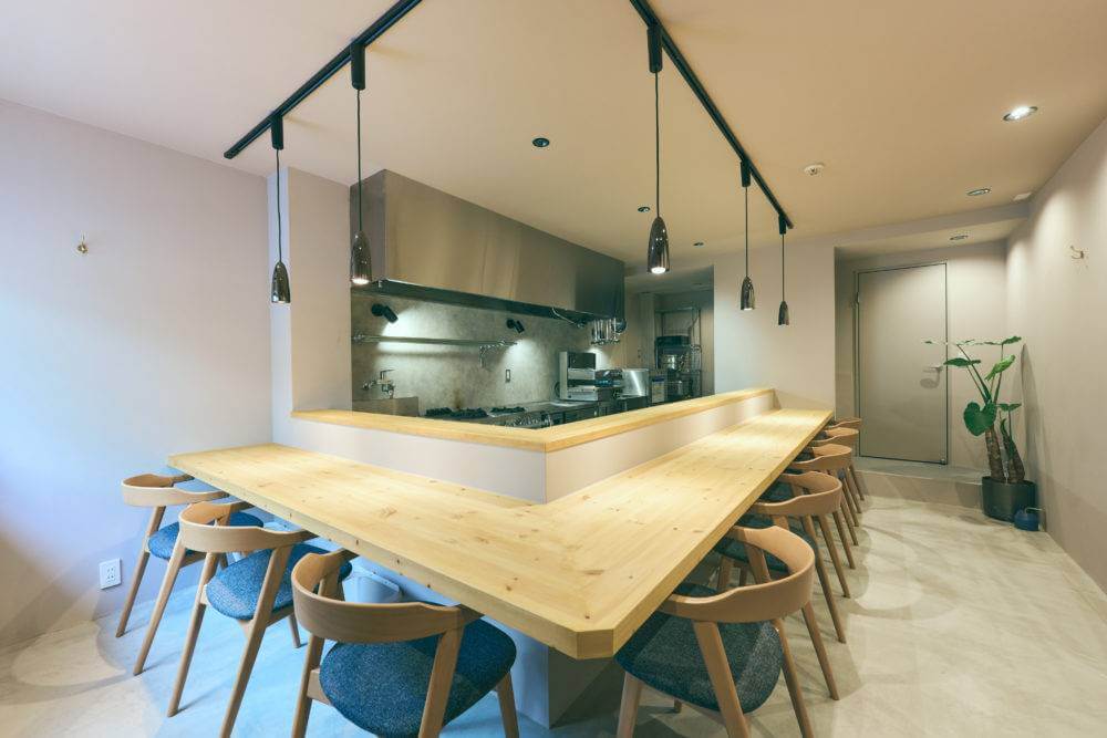 料理を提供する側とお客の「目線の高さ」「距離」を料理と価格によって調整いたします。厨房内は給排水の関係で客席側より床が高くなってしまいがちですが、厨房内と客席に高低差が出ないように工夫してます。
